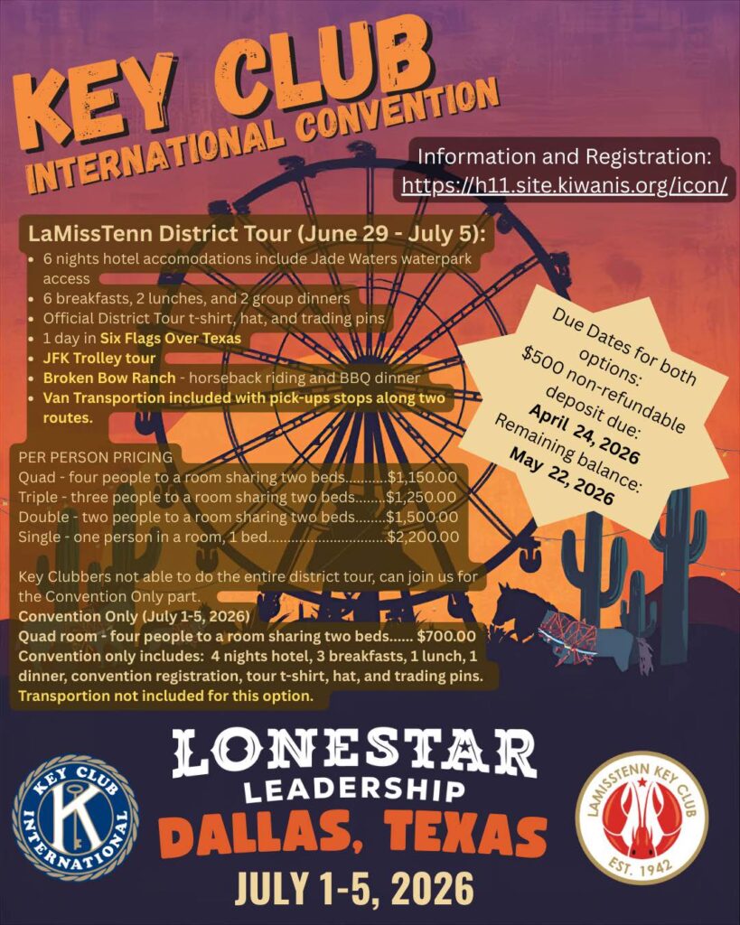 LaMissTenn Key Clubbers had an amazing time in Orlando, Florida for the 2025 Key Club International Convention! LaMissTenn had the opportunity to tour Orlando, visiting attractions such as Disney Springs and Universal Studios. LaMissTenn also enjoyed participating in sessions of the convention, attending workshops, hearing from inspirational speakers, participating in the elections procedure, mingling with fellow Key Clubbers, and so much more!